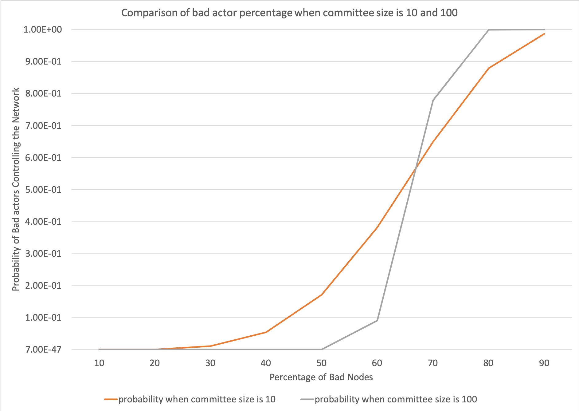 The above graphs were calculated using Excel (bad node variation where n is 100). These graphs show varying probabilities when the percentage of bad nodes is $20$, $40$, $60$ and $90$. The value when the probability plateaus is used to construct the following graph for both committee sizes $10$ and $100$.
