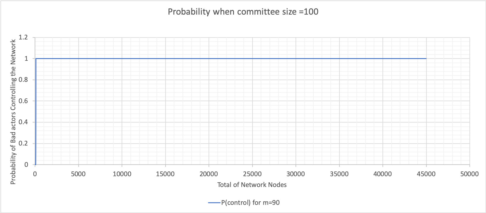 The above graph was calculated using Excel (variations of N with n fixed). For the graph showing varying probabilities with respect to the total number of network nodes, where the committee size is $10$, the probability dramatically increases when the total nodes is $3$ times more than the committee size and onwards. The probability plateaus at $0.35$.